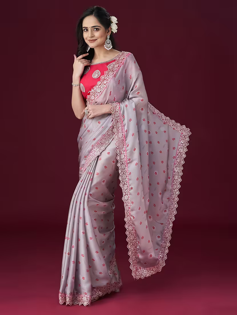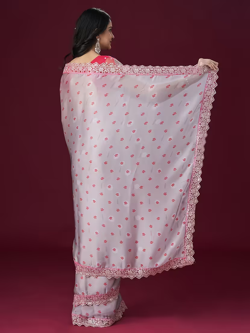Design Details\ Grey and pink saree\ Floral embellished saree with embellished border\ \ The saree comes with an unstitched blouse piece\ The blouse worn by the model might be for modelling purpose only. Check the image of the blouse piece to understand how the actual blouse piece looks like.\ \ Size & Fit\ Length: 5.5 meter plus 0.8 meter blouse piece\ Width: 1.06 meter (approx.)\ \ Material & Care\ Saree: Satin\ Blouse: Satin\ Dry Clean